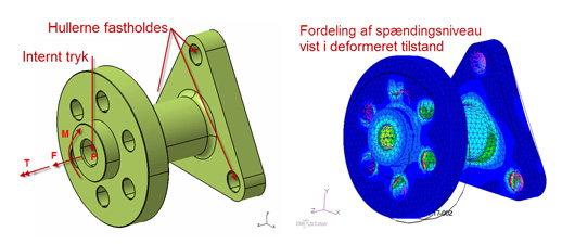 Det viste eksempel er en simpel beregning af en relativ kompleks 3D geometri fra en adapterkobling, som skal fremstilles i standard metal/polymer. Parten fastholdes på definerede steder og belastning specificeres som tyngdefeltet/tryk/kræfter/temperatur m.fl.