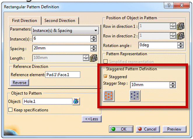 Staggered vælges til som vist herunder, herefter kan ”størrelsen” på forskydningen sættes ind, samt om forskydningen skal starte fra anden eller første søjle. Forskydningen findes også til cirkulære patterns.